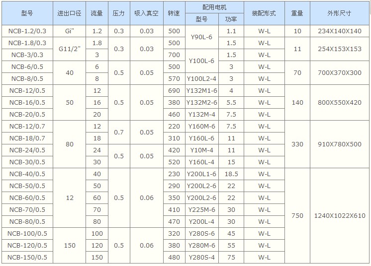 NCB型内啮合高粘度齿轮泵性能参数表: